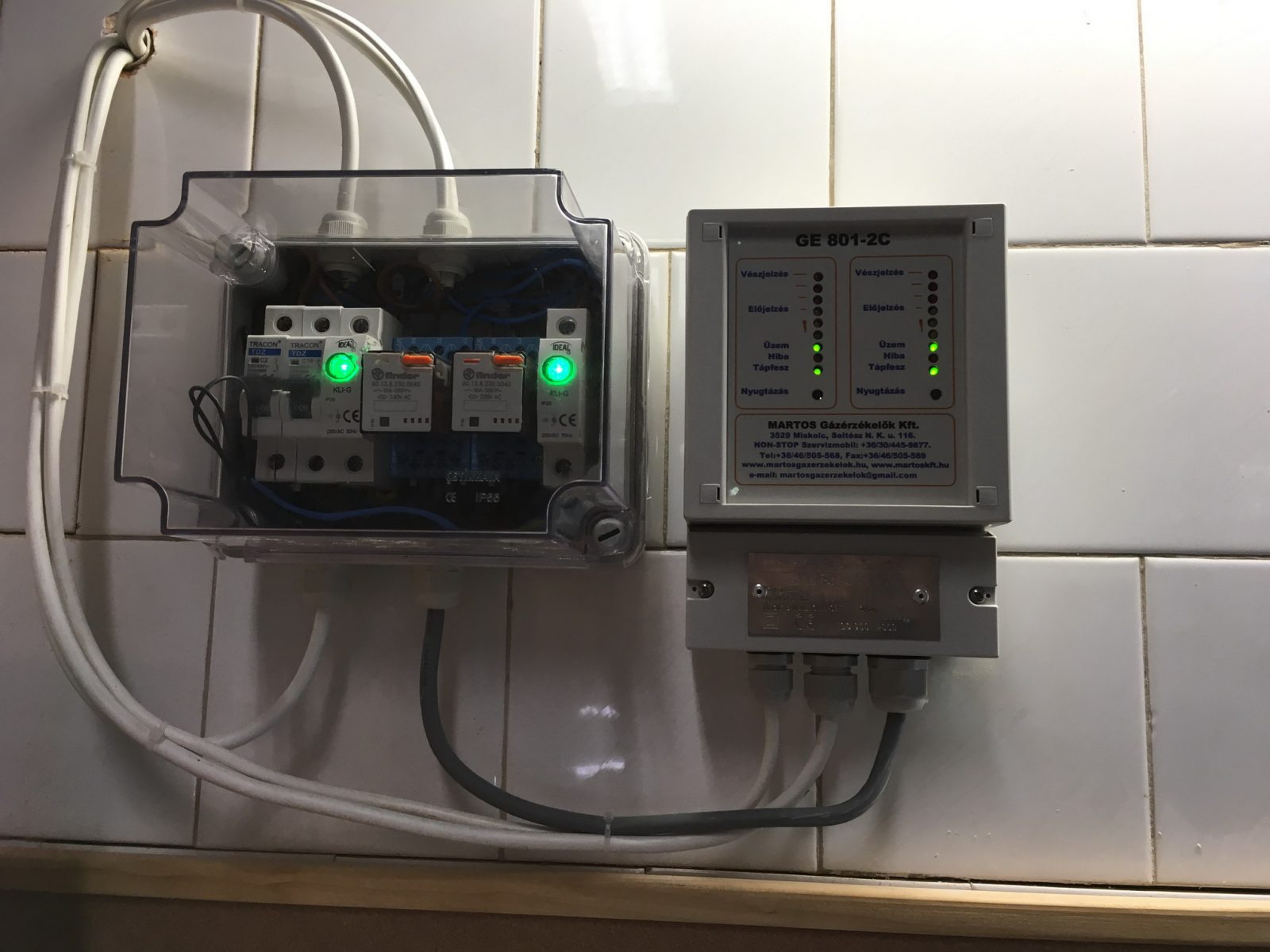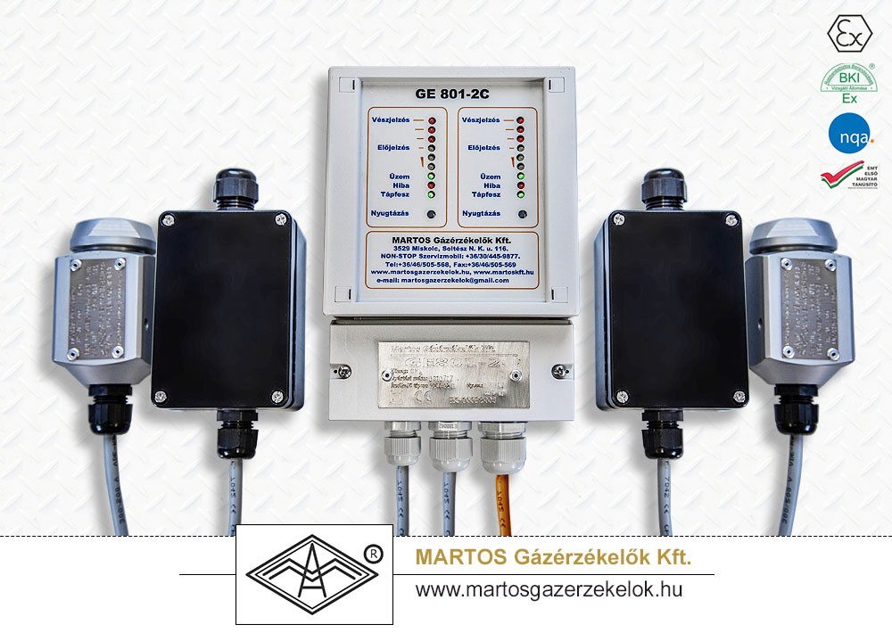 GE-801-2C típusú két mérőhelyes, két jelzési szintes gázérzékelő készülék a megrendelő által meghatározott közegre és értékre való beállítással kerül kiszállításra (Pl: Metán ARH 20% elő-, ARH 40% vészjelzés).